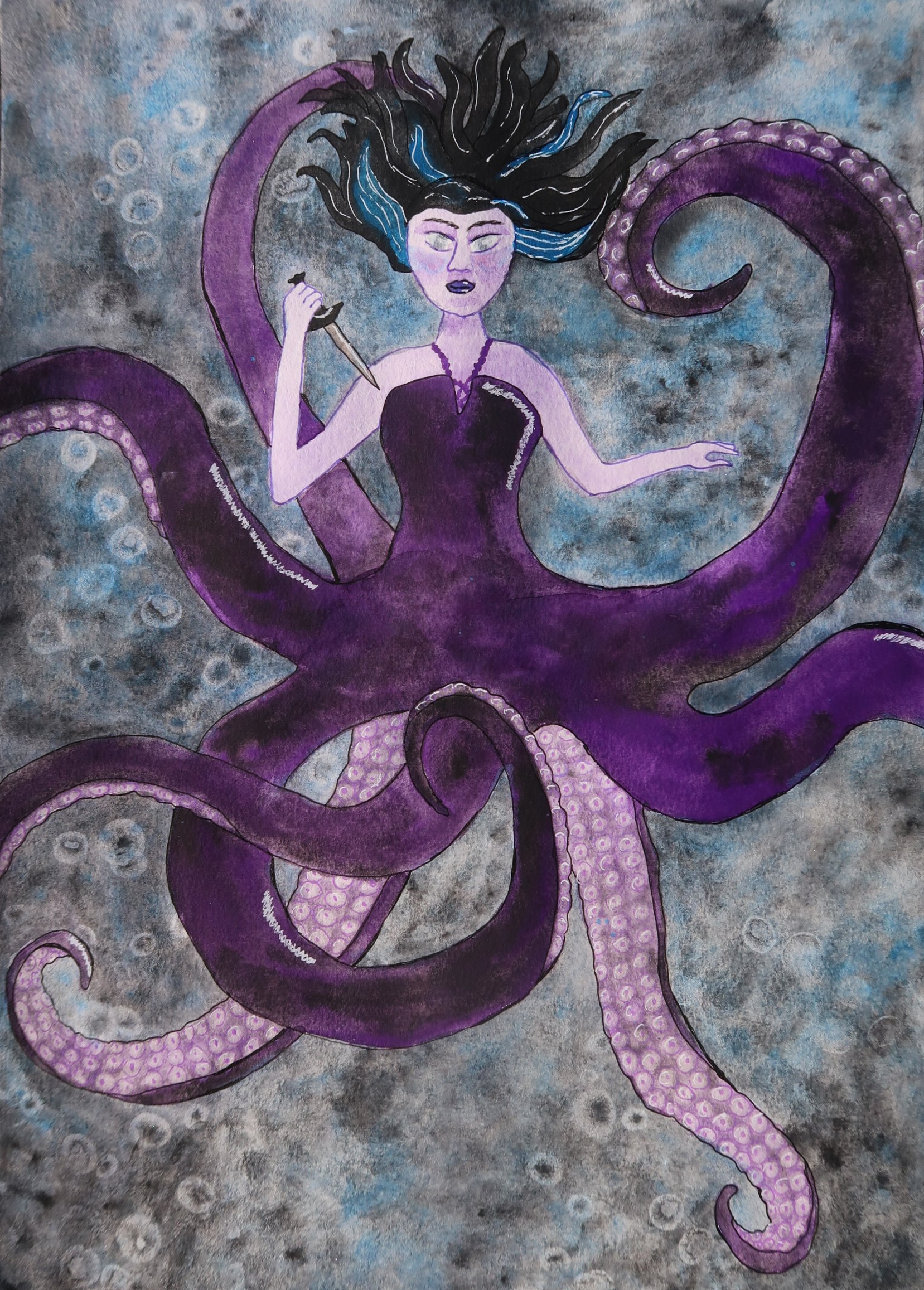 This Cecaelia Mermaid was inspired by Ursula of Disney's The Little Mermaid rendition, and also by Leigh Bardugo's version in her short story collection The Language of Thorns. It is an original watercolor and ink piece meant to evoke power and independence.