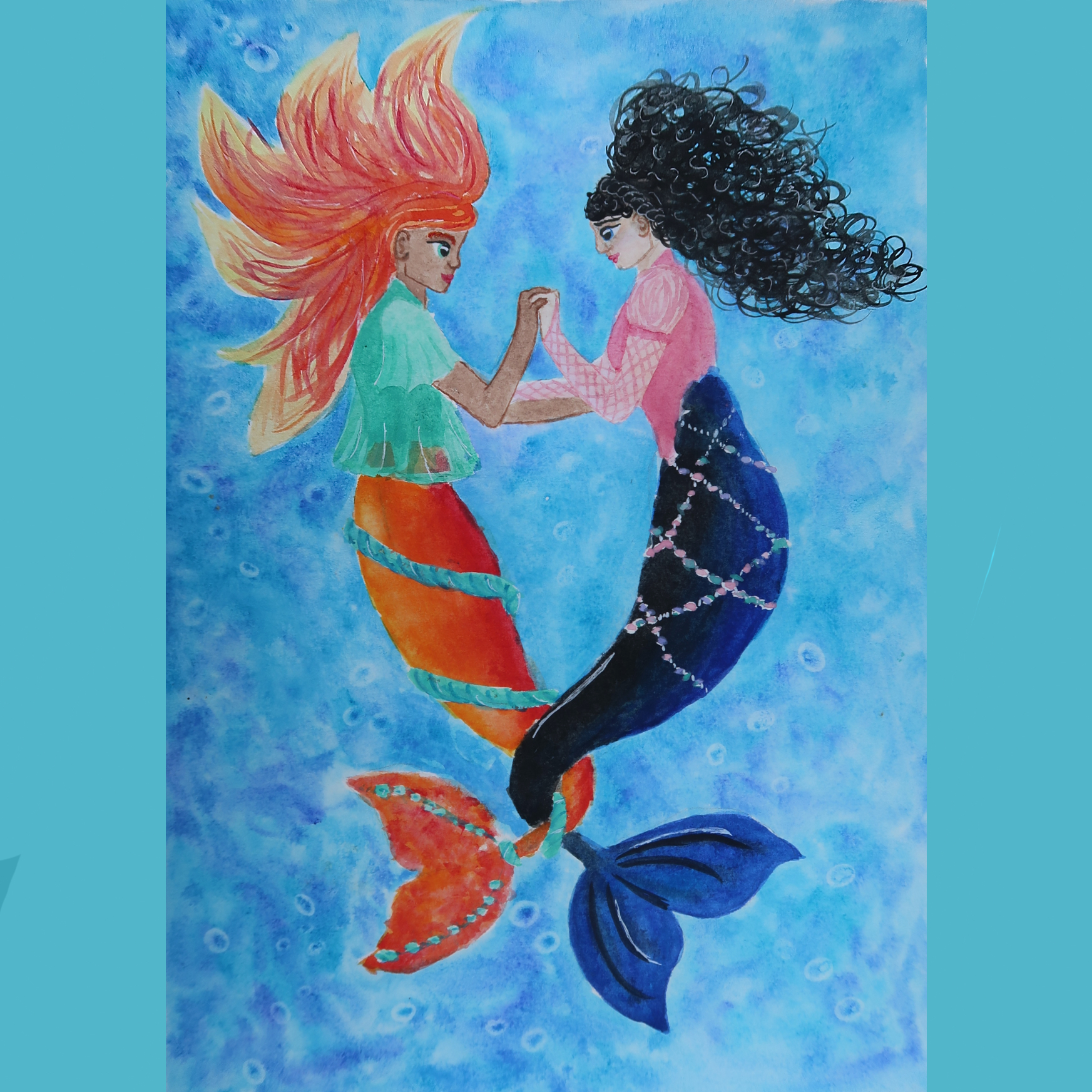 This pair of mermaids is having a lovely time dancing under the sea, dressed in flowy and embroidered tops and with scarves and beads draped around their tails. This is a print of an original watercolor piece. Printed on 8x11 matte photo paper.