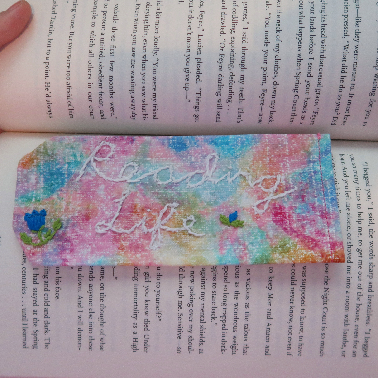 This bookmark was hand embroidered and sewn with the words "Reading Life" in white floss and a tulip and bud in blue and green on beautiful multicolored fabric with pink, orange, blue, green and white interwoven. It is double thickness with the back side being the same fabric without embroidery. This bookmark is about six inches by two and a half inches.