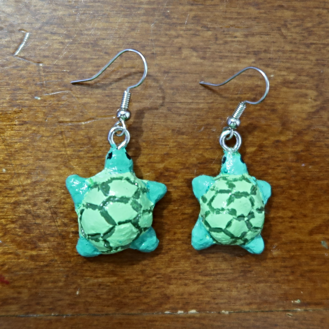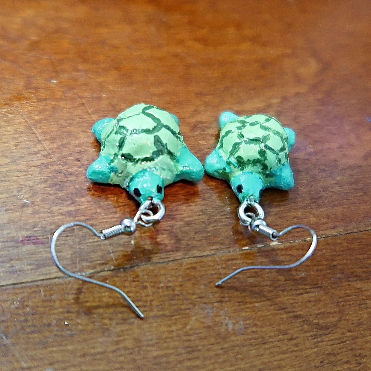 These earrings are hand molded with clay and then painted by hand. Each turtle is about 1.5 cm long.