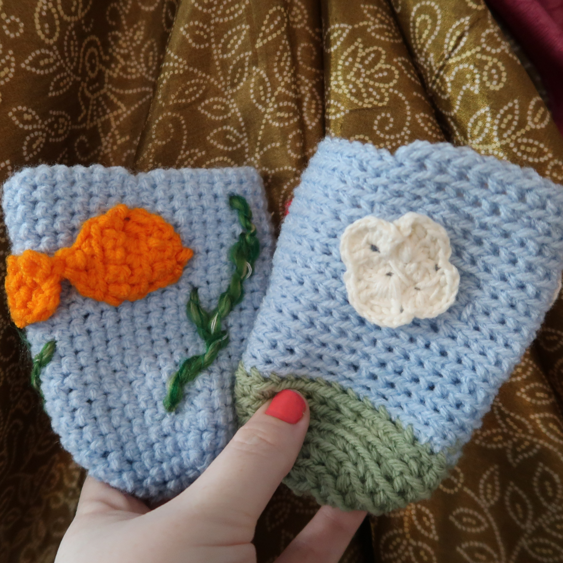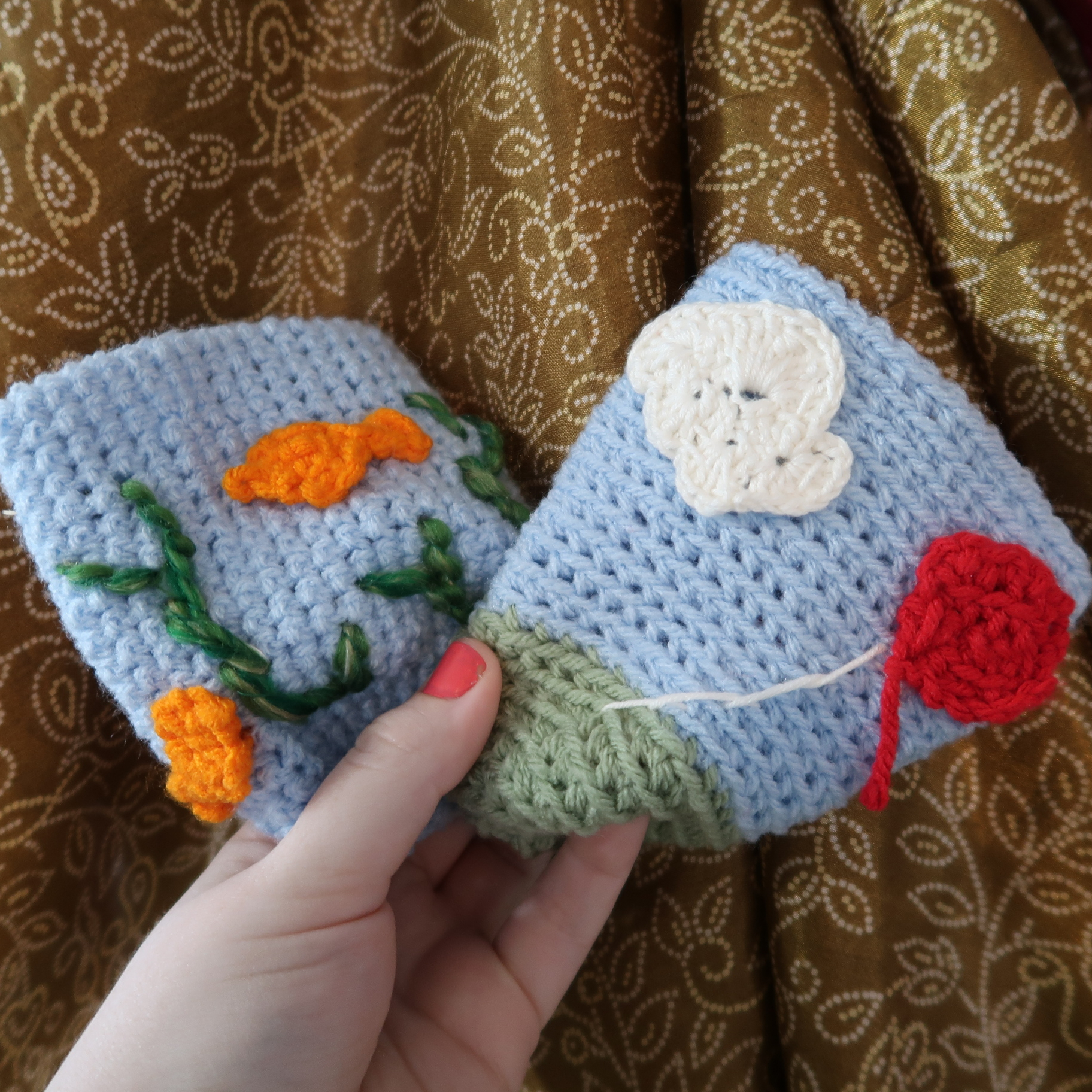 These cozies are crocheted by hand. The Underwater design has two small goldfish and one large with strands of yarn to emulate seaweed on a blue background. The Sky design has a red kite with a tail and white string as well as white clouds on a blue background with green at the bottom. They fit a 12 oz can.