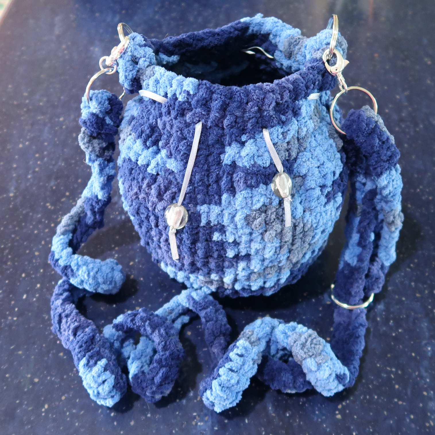 This bag was hand crocheted and themed after a blueberry. The drawstring is ribbon with bead endings. The strap is adjustable and detachable so it can be used as a clutch. It is not lined because the yarn is hardy and thick, and so the price point can be lower. It is 7 inches tall and 6 inches at the widest.